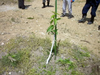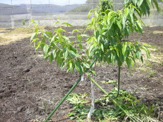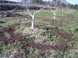 | 主幹に石灰を塗って凍害を防止します。 | 若木に支柱を立てて、主枝を誘引します。 |